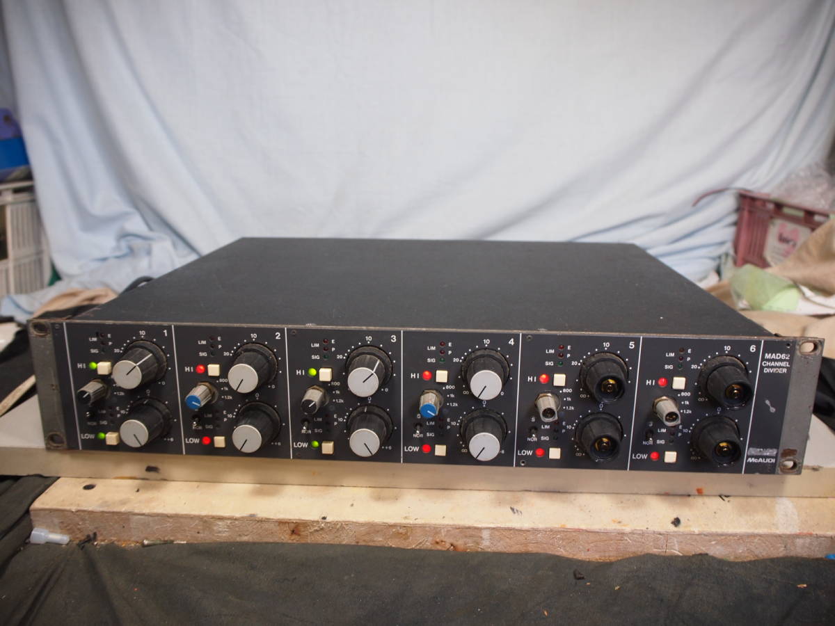 ステレオで(6回路)3系統の、2ウェイ(クロス800 1K 1.2K)ですので家庭での使用には(2回路)1系統のみで残り(4回路)2系統は使用しないでください。 SRの、現場ではこのような仕様での需要が あるか疑問ですが とにかく1台に2ウエイの チャンネルディバイダーが6回路はいっていて 内部の基板を見ましたが かなりコストのかかった作りで当時価格が258000円らしいです もしSRの現場で使って便利なことは 通常 2回路の使用でチャンネルに不具合があるときに4回路の予備が常に待機できていますのでそれに関しては利用価値があります 当方で点検しましたが不具合は整備済みです ワケアリは5,6のつまみのキャップありませんのでお安く 最後の1台になりました この価格は 2チャンネルのステレオで使用して 不具合出たとき 他の 予備チャンネルに入れ替えで、つかっていただくのが、前提ですので 修理は(保証も含む)使える予備チャンネルが なくなったときの保証 及び保証外修理としますのでお安く HIも、LOWも外側のVOLで微調できます 外側ツマミの、HIは -10で、フラット LOWは±0で、フラットでそれぞれ時計回りで上昇反時計回りで下降しますこの時クロス周波数の変化はなくそのクロス周波数に対して 3デシベルほど変化します、またN-Sは Nが、ノーマル Sは シフトと 思われますが 90°位相が変りますこれにより低音と高音の振動版の時間差補正が 0° 90° 180°を選べれるので使いやすく HIもLOWもシグナルのON OFF もでき またシグナル表示も非常に便利ですし通常 A7等の38センチクラスの ウーファーと 1インチタイプの ドライバーの 能率差が、10デシベルくらいなので当機のツマミがほとんど センターでレベルが合います 家庭で2チャンネル使用ですとこの機器の1/3しか使いませんので258000円の1/3で83000円として中古整備品ですのでお安く さらに面白い使い方として 1を左の低音(800 1 1,2) 3を左の高音(800 1 1,2)で使用できますので普通クロス周波数は選んだ 800か1か1,200の中のたとえば800Hz のみですが 1と3を左 2を右の低音 4を右の高音で使用しますとクロス周波数は その1 (低音のクロスを 800 高音のクロスを 800) その2 (低音のクロスを 800 高音のクロスを 1k ) その3 (低音のクロスを 800 高音のクロスを 1,2k) その4 (低音のクロスを 1k 高音のクロスを 800) その5 (低音のクロスを 1k 高音のクロスを 1k) その6 (低音のクロスを 1k 高音のクロスを 1,2k) その7 (低音のクロスを 1,2k 高音のクロスを 800) その8 (低音のクロスを 1,2k 高音のクロスを 1k ) その9 (低音のクロスを 1,2k 高音のクロスを 1,2k) 以上の9パターンでの接続が可能になります 即決落札に方にはRCA-XLRの変換 オス2個 メス4個 をお付けします