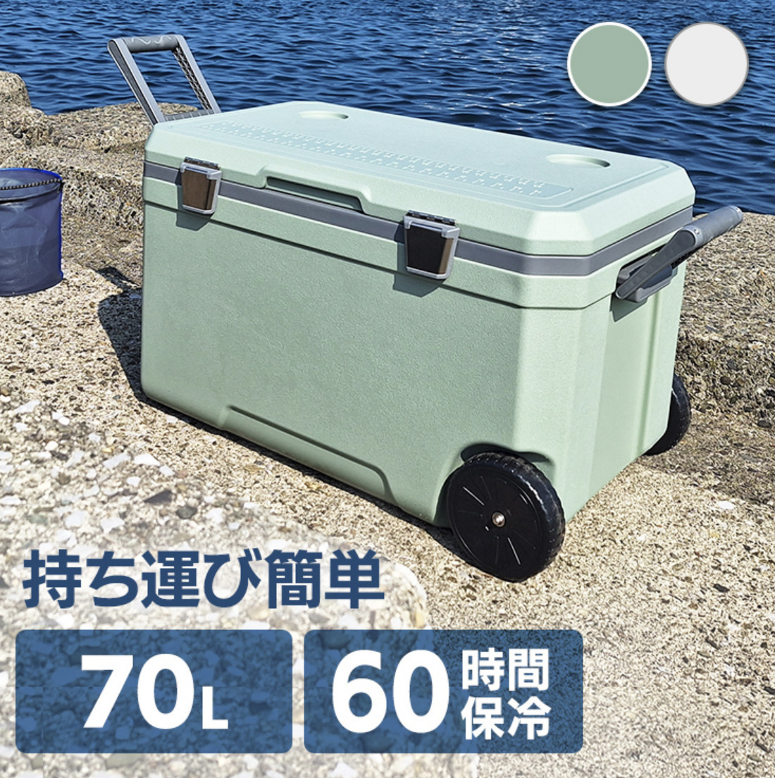 ■ポイント 70L大容量クーラーボックス。 持ち運びに便利なハンドルと車輪付き。 釣りやアウトドア、海水浴など様々な場面で使えます。 中の物を取り出さずに排水できる水抜き栓付き。 ■商品説明 ●カラー グリーンorホワイト (カラーに希望がある場合は事前にご連絡下さい。) ●容量 70L ●商品サイズ(cm) 外寸:幅約71×奥行約44×高さ約43 内寸:幅約63×奥行約34×高さ約34.5 ●商品重量 約8kg ●材質 蓋・側面:PE ハンドル:ポリプロピレン 断熱材:ウレタン ●耐荷重 約130kg ※商品改良に努め仕様とデザインは、予告なく変更される場合があります。 ※モニターや環境により、色の見え方が実際の商品と異なる場合がございます。 ※ご注文が集中した場合、物流倉庫の混雑等により、発送が遅れる場合がございます。 ※北海道、沖縄、離島・一部地域は追加送料がかかる場合があります。事前にお問い合わせ下さい。
