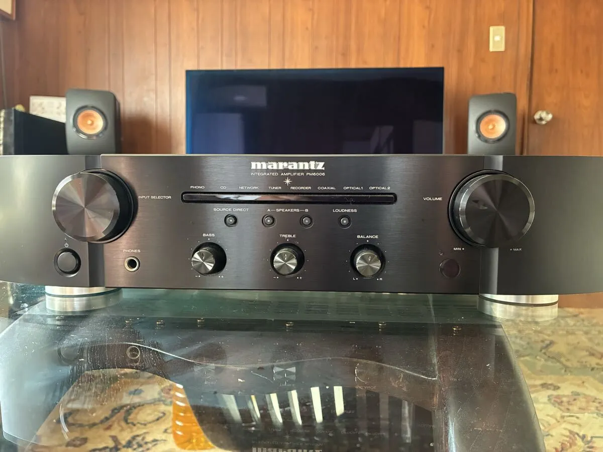 Главный усилитель Марантца, PM6006. Цвет черный и имеет сложный дизайн. Там нет заметных царапин или грязи, и он сохраняет относительно хорошее состояние. PHONO, CD, NETWORK, TUNER, RECORDER, COAXIAL, OPTICAL1, OPTICAL2 и др. B., TREBLE, BALANCE и LOUDNESS могут быть настроены на желаемое качество звука. |
