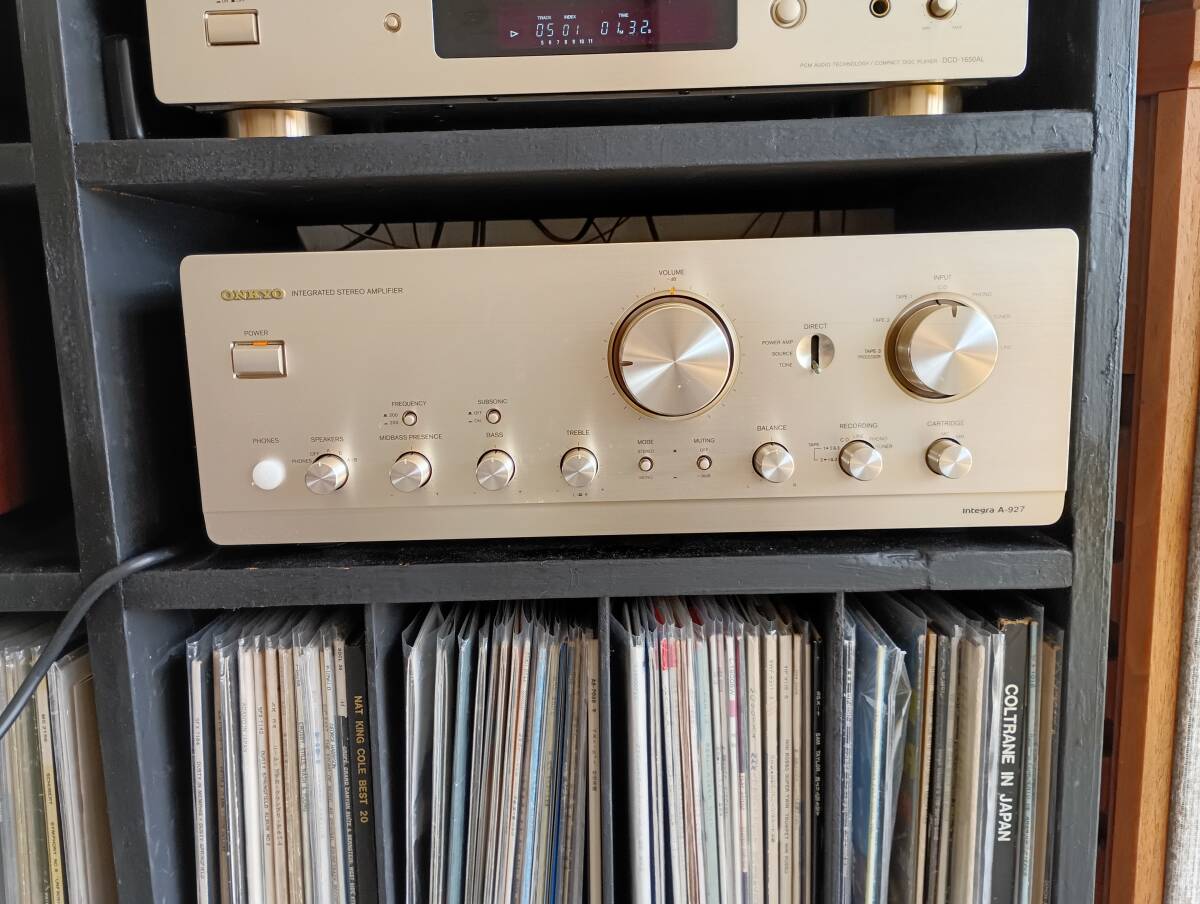 ONKYO Integra A-927 プリメインアンプ です。 [仕様] ・メーカー ; ONKYO ・機種 ; Integra A-927 ・定格出力 : 160W+160W(4Ω、20Hz~20kHz) 100W+100W(8Ω) ・外形寸法 : 幅445x高さ165x奥行434mm ・重量 : 18kg アナログプレイヤーに対応するため、MM/MCフォノイコライザーを搭載しています。 詳細仕様は、「オーディオの足跡」をご確認下さい。 [動作] レコード盤、CD、チューナーの再生に使用したアンプです。完動品です。 但し、上記3系列以外は未使用に付、動作未確認です。 [外観] 小さなすり傷はありますが、比較的綺麗な製品です。 詳細は画像をご参照下さい。 重量物ですので、厳重な梱包でお送りします。 尚、販売開始時期が1997年代の古い製品です。 上記、ご理解の上、ノークレームノーリターンでお願いします。