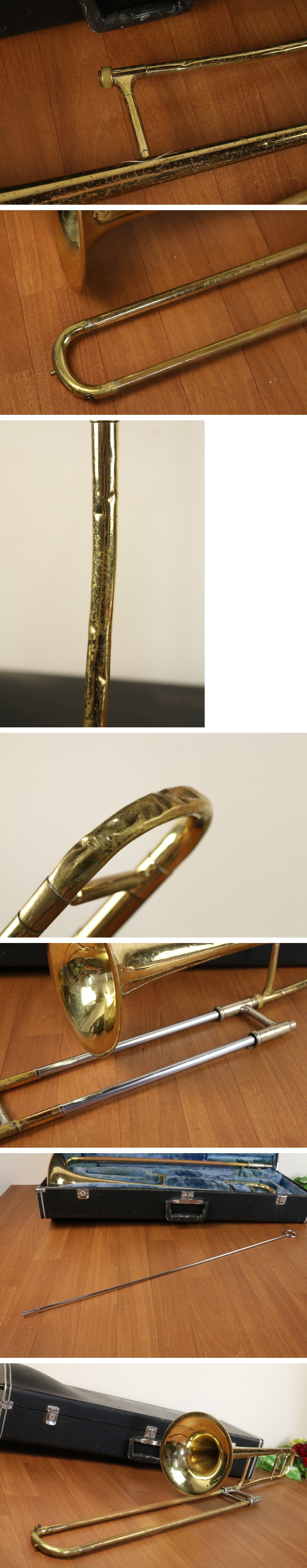 現状でお願いします。 傷汚れへこみがあります。 ウォーターキーは破損欠品あり。 主管抜差管は抜き差しできません。 マウスピースは欠品です。 画像のもので全て。
